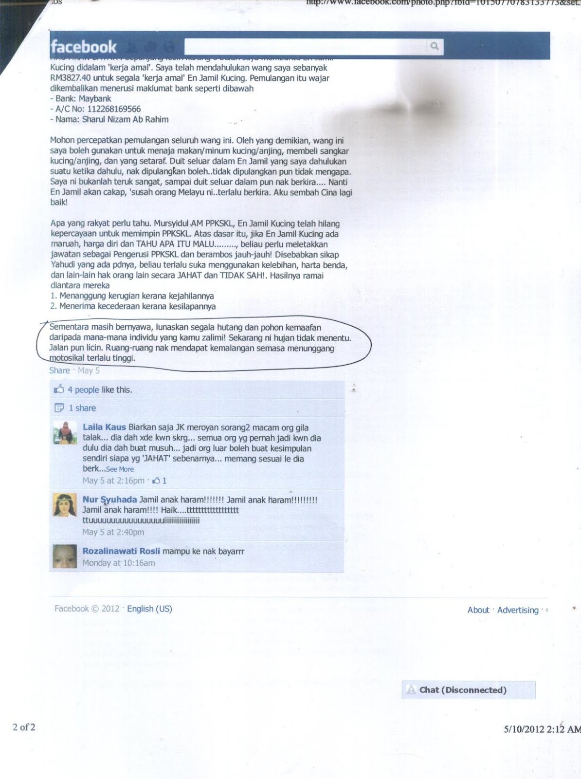 Nampaknya tak habis habis lagi sharul nizam anak rahim ni lagi rupanya rupanya. bukan sahaja fithnah , menipu , malah suruh saya bayar balik segala duit yg dia bagi untuk kucing yg jamil kira tak sampai rm 500-rm700.